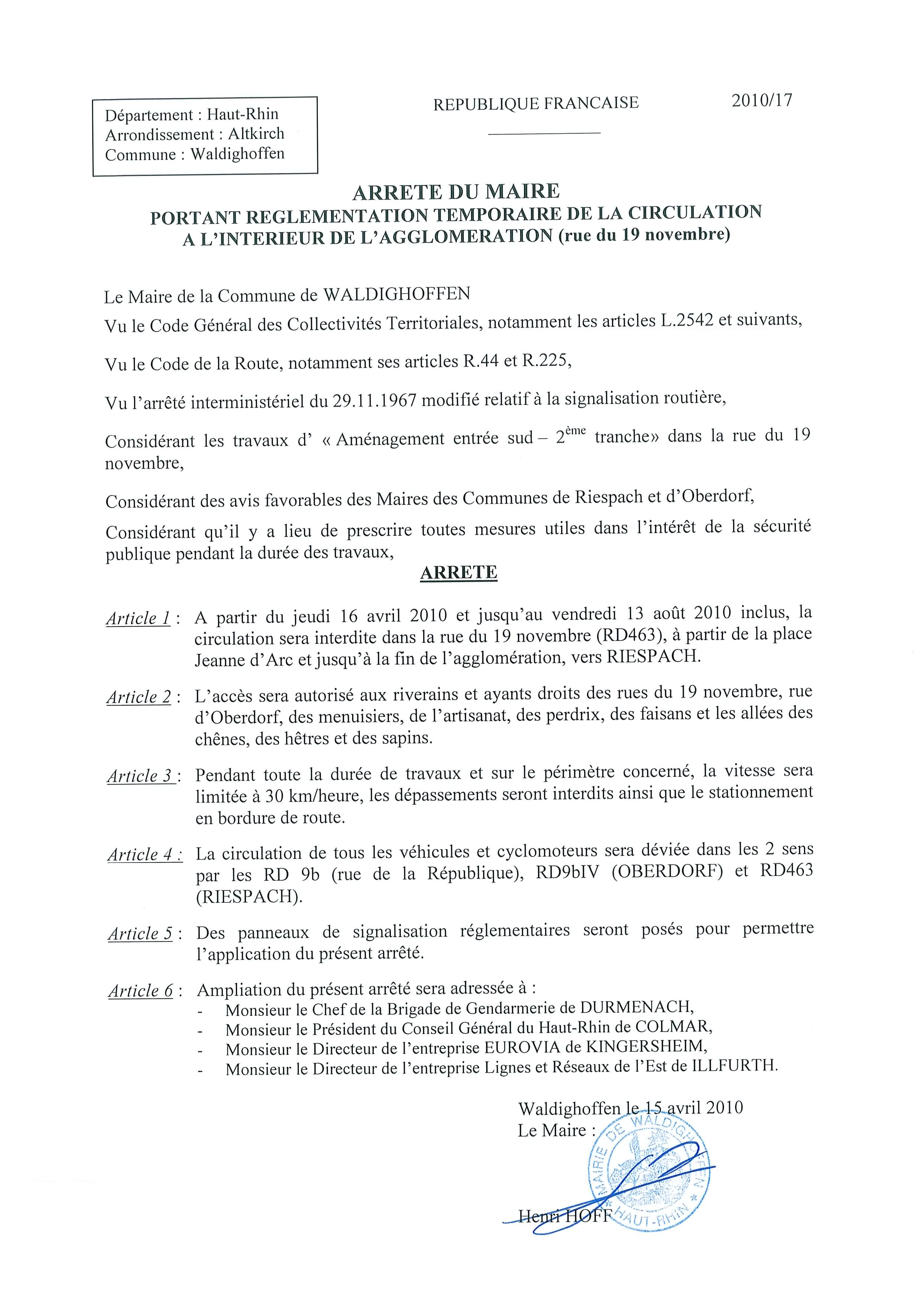 Arrêté du Maire n°2010/17 portant réglementation temporaire de la circulation à l'intérieur de l'agglomération rue du 19 novembre du 16 avril au 13 août 2010.