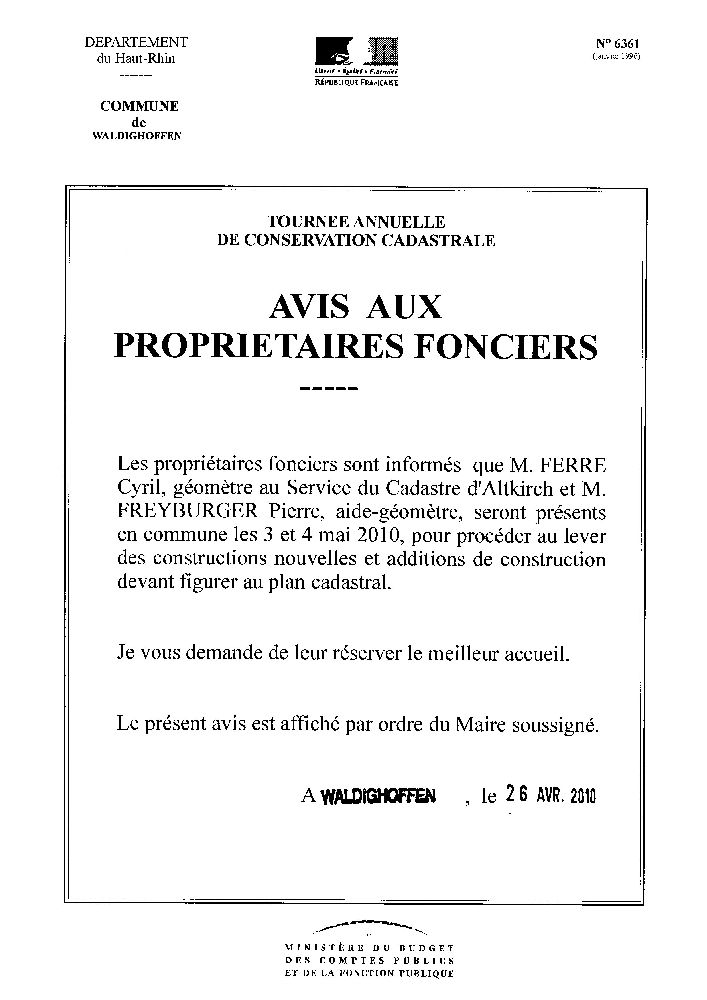 Avis de tournée annuelle de conservation cadastrale les 3 et 4 mai 2010