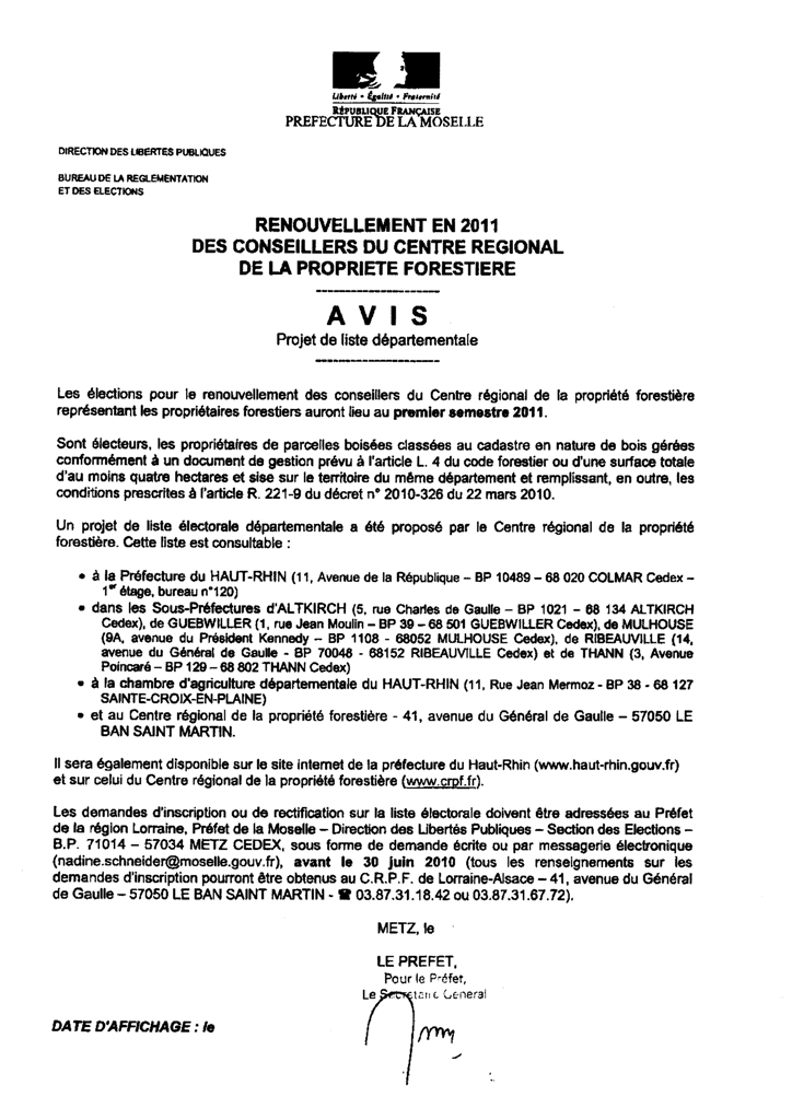 Avis de projet de liste départementale pour le renouvellement des conseillers du centre régional de la propriété forestière
