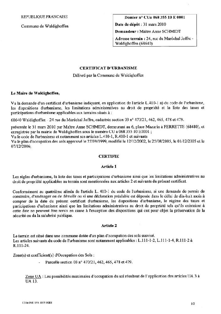 Vous êtes ici : Accueil Mairie Affichage public Annexes affichage public 2010 CU 10 E 0001 Me Schmidt 1