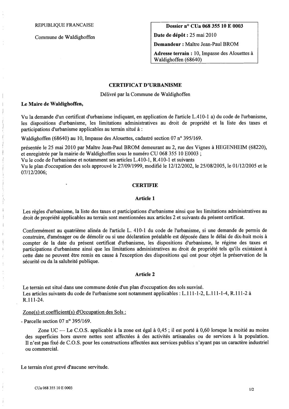 Certificat d'ubanisme n° CU10E0003 - Me Jean-Paul BROM