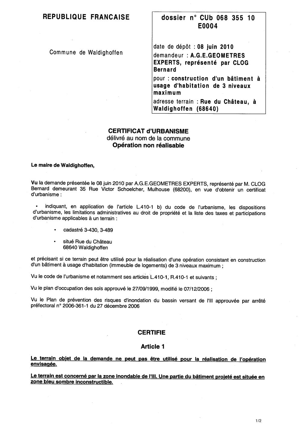 Certificat d'urbanisme n°10E0004 - A.G.E. GEOMETRES EXPERTS par M. Bernard CLOG