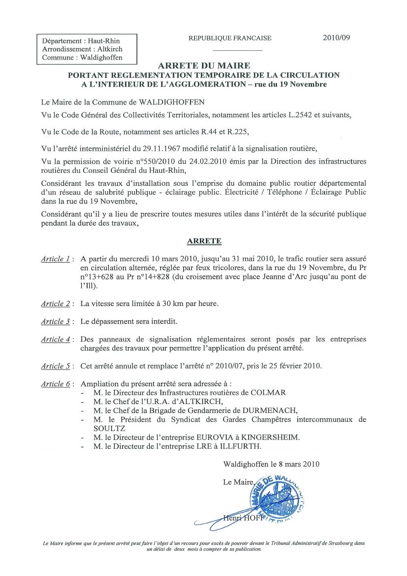 Arrêté n°2010/09 portant règlementation temporaire de la circulation à l'intérieur de l'agglomération - rue du 19 novembre.