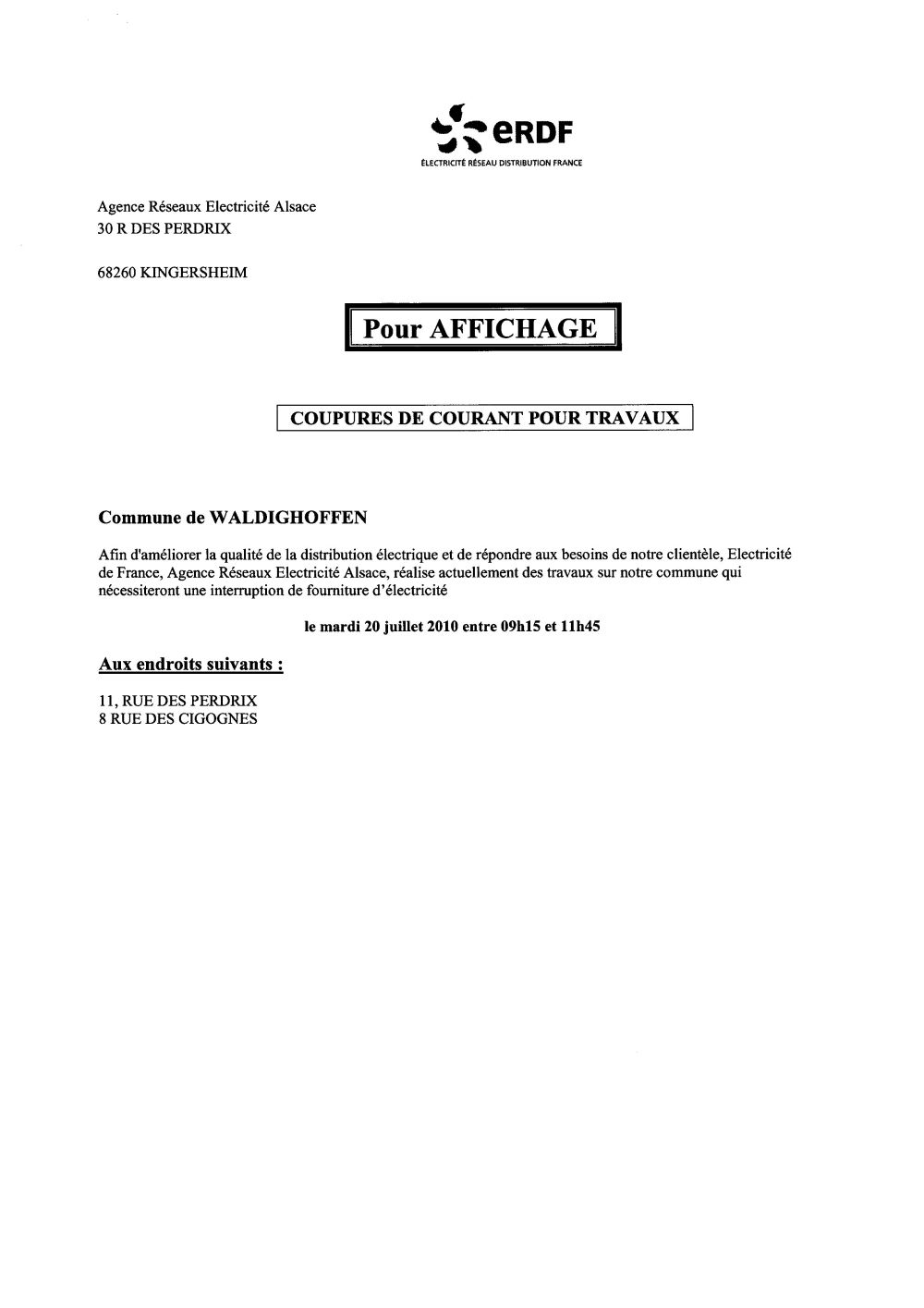 Avis de coupure de courant à Waldighoffen le 20 juillet 2010