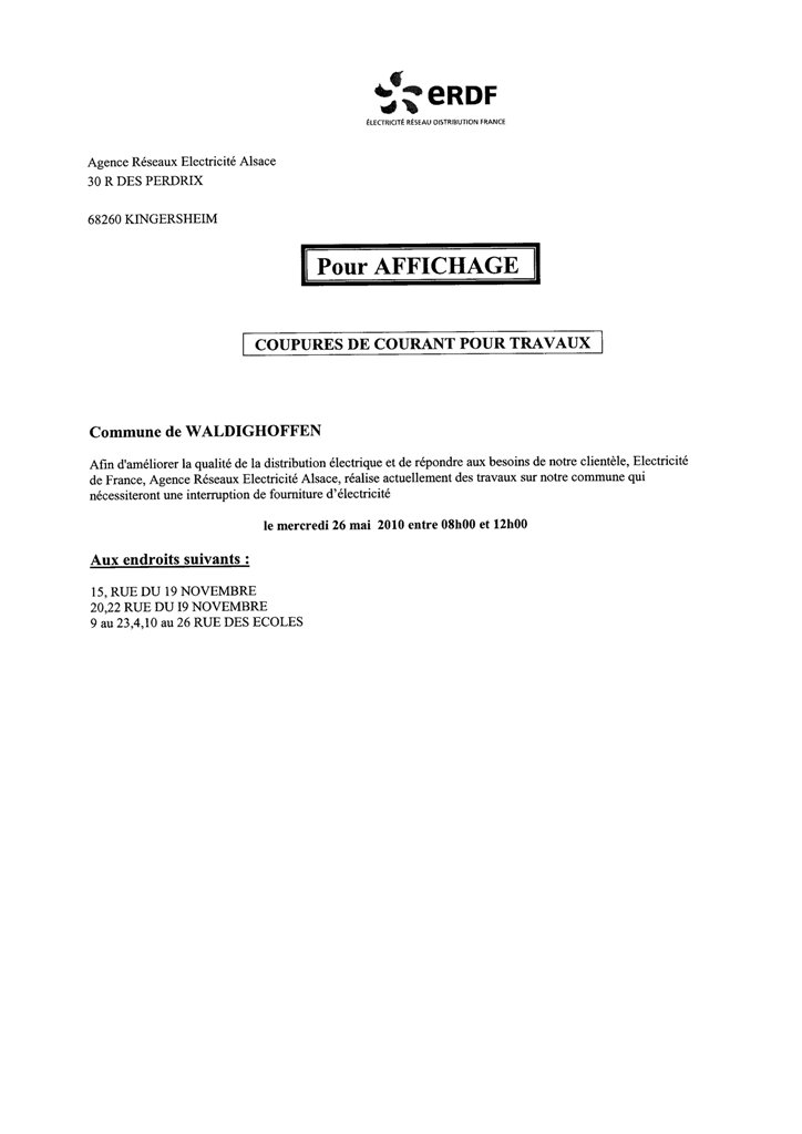 Avis de coupure temporaire de la distribution électrique du 26 mai 2010 à Waldighoffen.