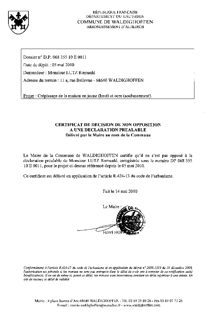 Vous êtes ici : Accueil Mairie Affichage public Annexes affichage public 2010 Décision DP 10E0011 LUTZ