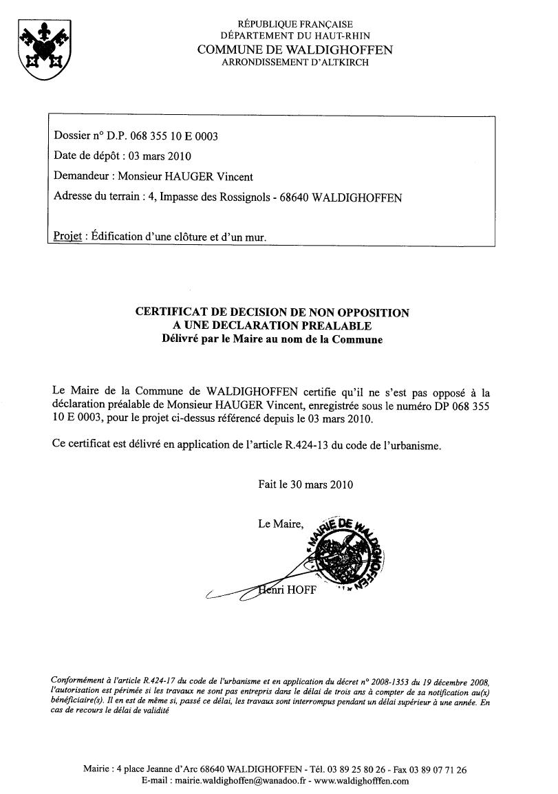 Certificat de non opposition du 30 mars 2010 à la déclaration préalable de M. HAUGER Vincent.
