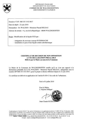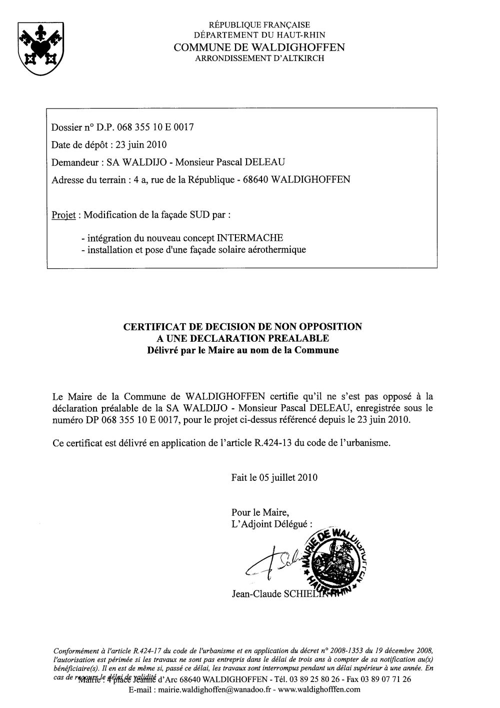 Certificat de non opposition à la déclaration préalable n°068 355 10 E 0017 déposée par la SA Waldijo.