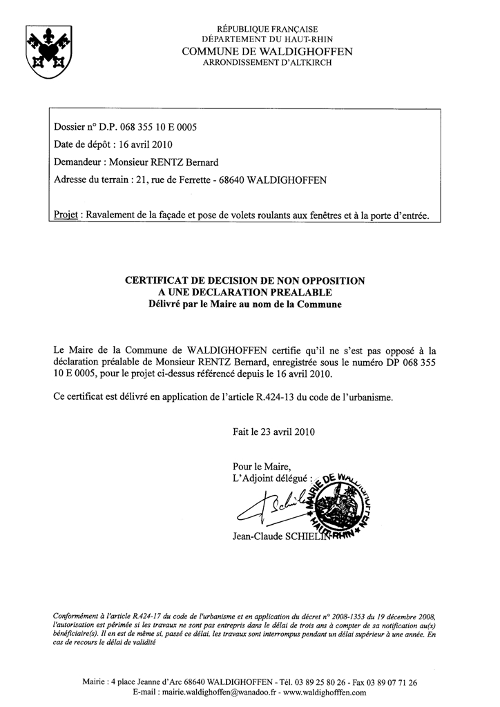 Décision suite au dépôt de la déclaration préalable n°DP068 355 10 E 0005 par M. RENTZ Bernard.