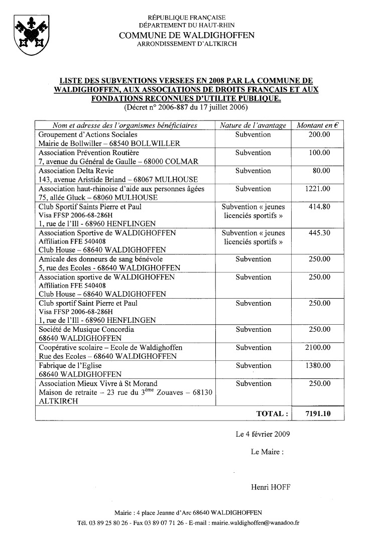 Liste des subventions versées en 2008 par la commune de Waldighoffen aux associations