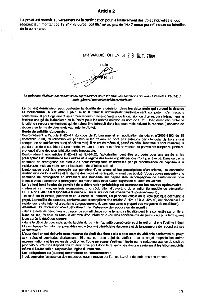 Deuxième partie de l'Arrêté Municipal du 8 décembre 2009 accordant un permis de construire à Madame EGLIN Tania.