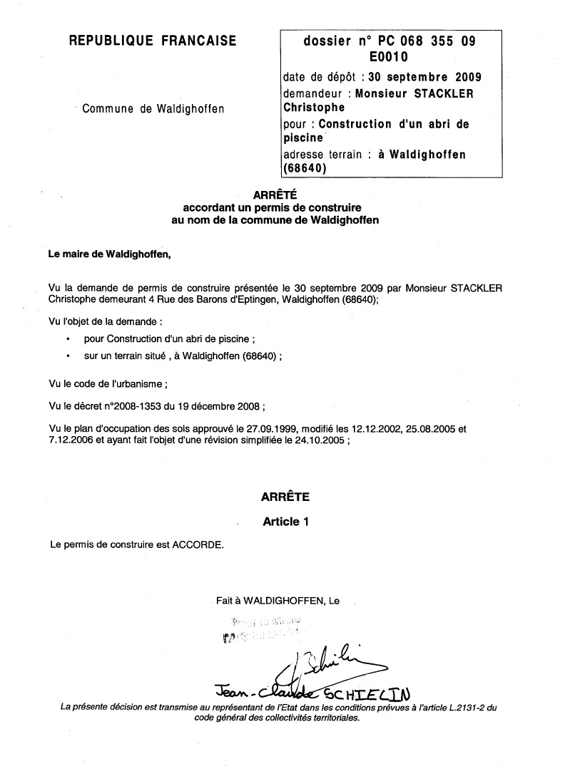 Vous êtes ici : Accueil Mairie Affichage public Annexes affichage public 2010 Arrêté permis de construire STACKLER Christophe