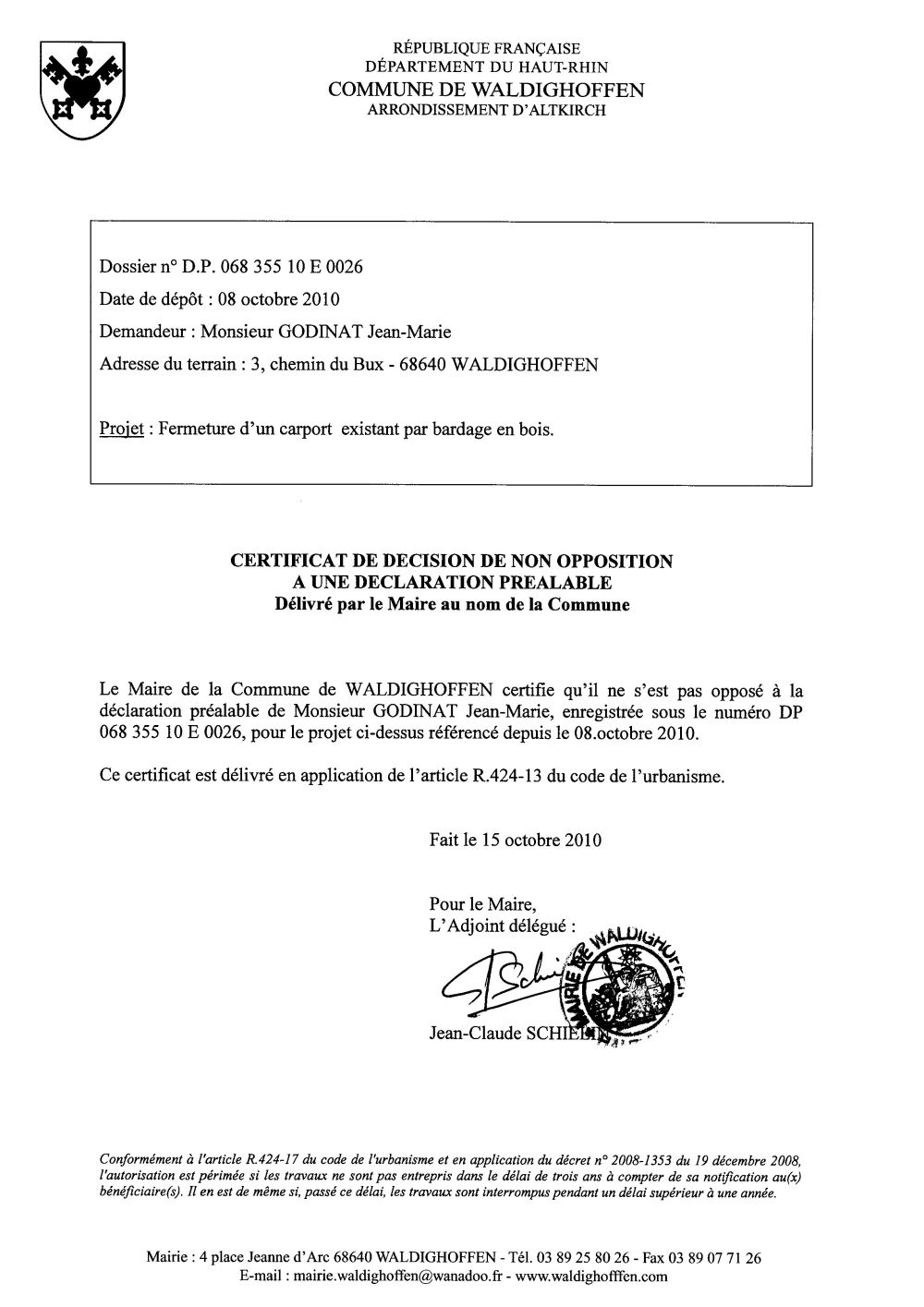 Non-opposition à une déclaration préalable - DP06835510E0026 - M. GODINAT Jean-Marie