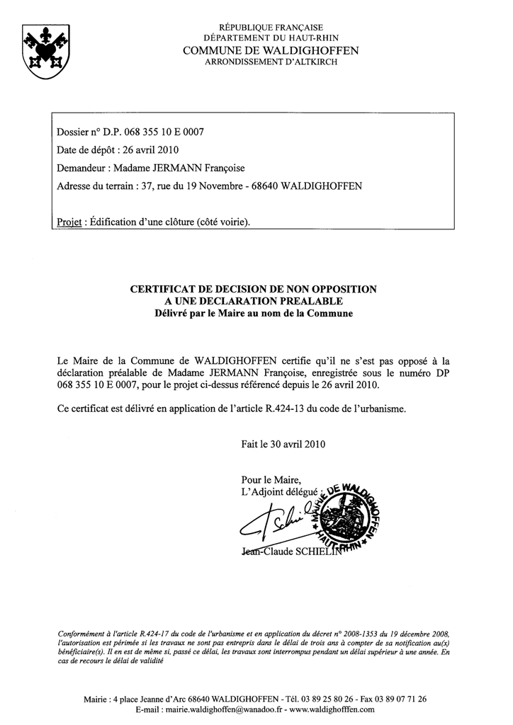 Vous êtes ici : Accueil Mairie Affichage public Annexes affichage public 2010 Non opposition DP 10E0007 Mme JERMANN Françoise
