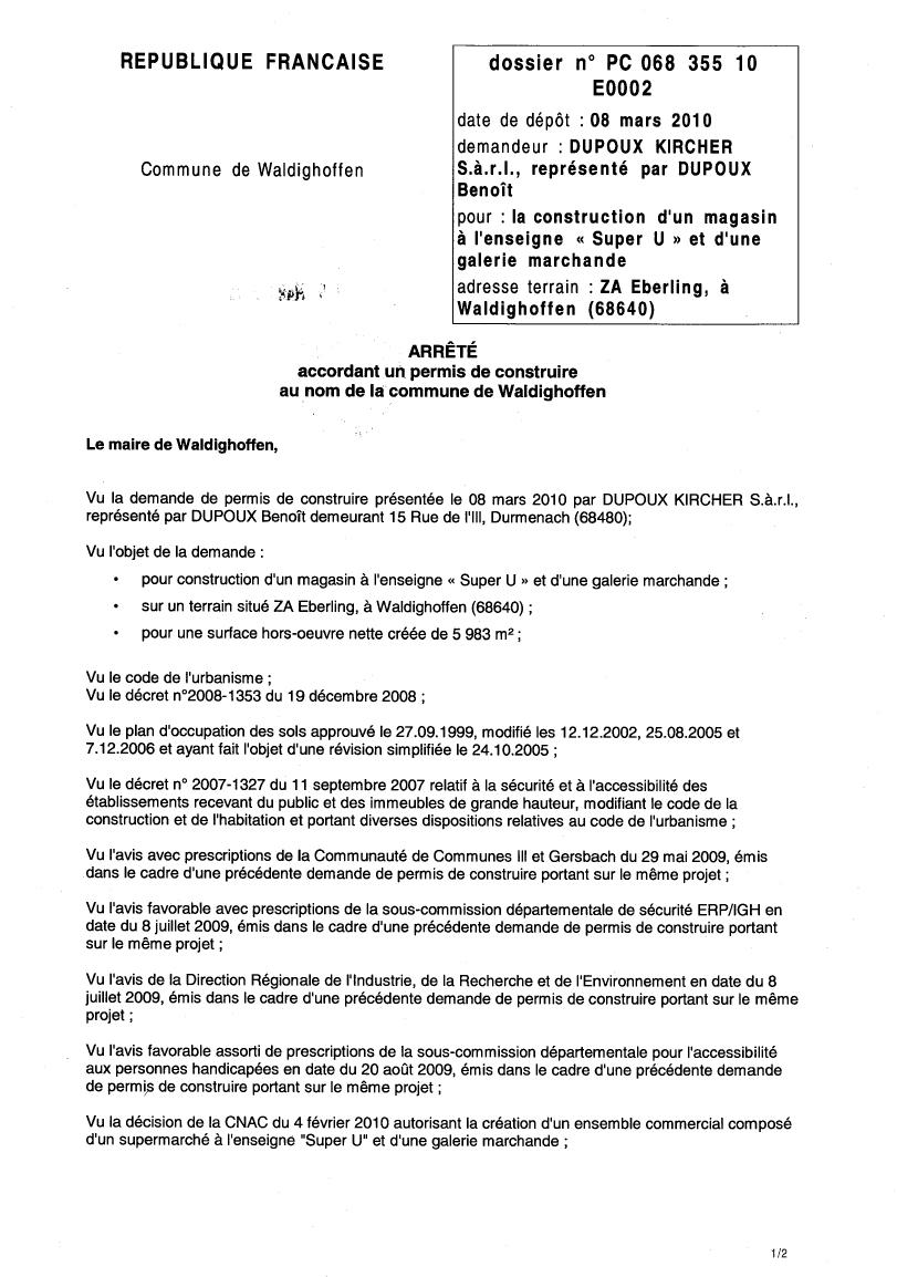Première page de l'Arrêté Municipal du 29 mars 2010 accordant un permis de construire à la Sàrl DUPOUX-KIRSCHER.