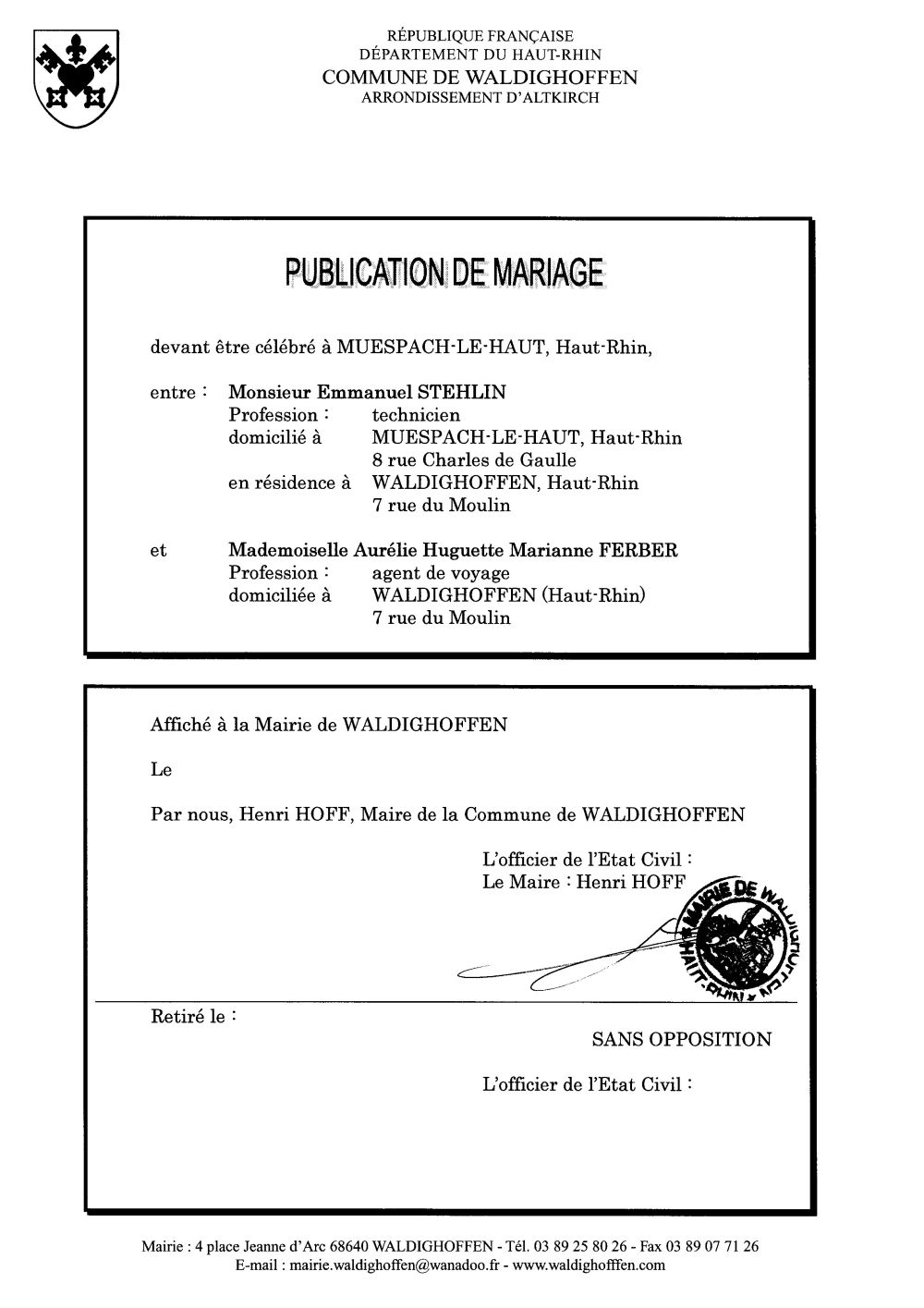 Avis de publication du mariage projeté à Muespach-le-haut entre M. STEHLIN Emmanuel et Mlle FERBER Aurélie