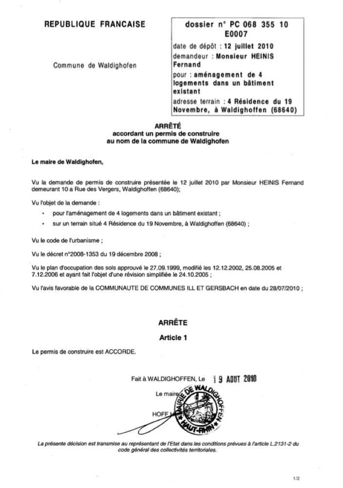 Arrêté accordant le permis de construire PC 068 355 10 E 0007 déposé par M. HEINIS Fernand.