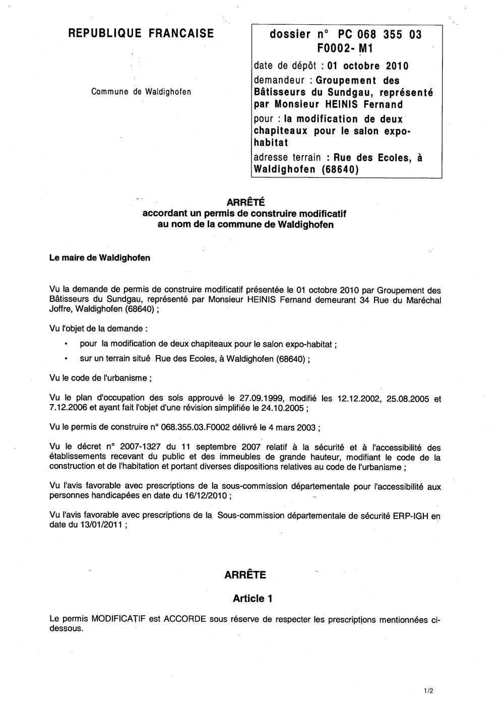 Arrêté accordant le permis de construire modificatif n°03F0002-M1 du G.B.S.