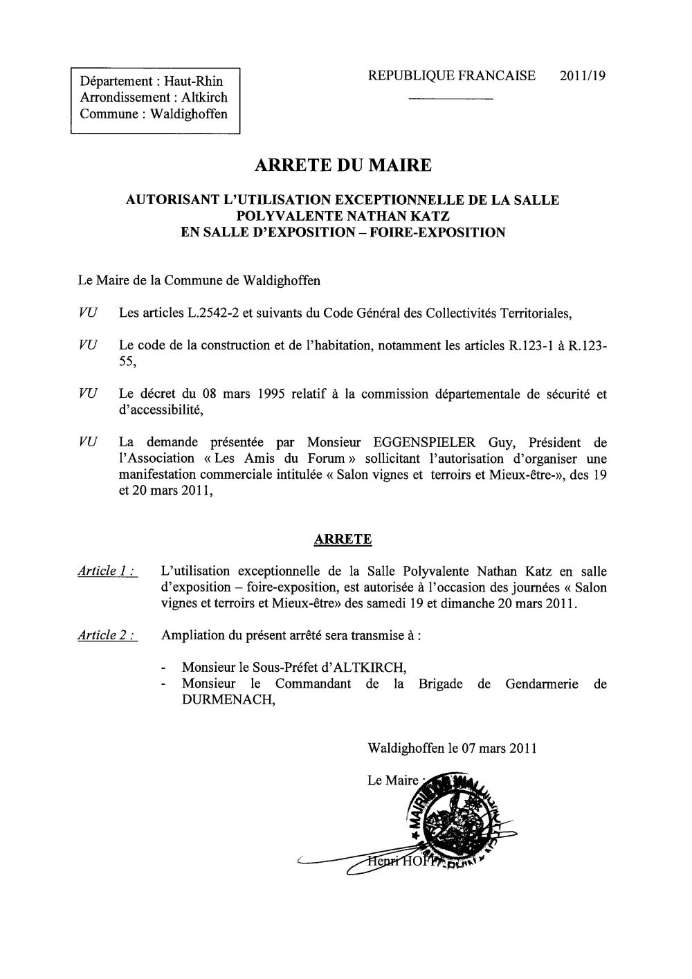Arrêté n°2011/19 autorisant l'utilisation de la Salle Polyvalente