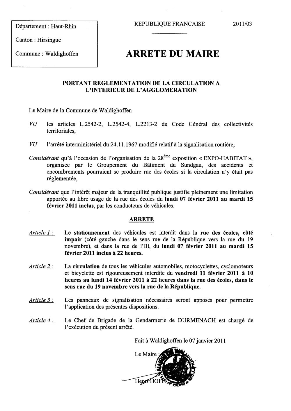 Arrêté du Maire portant réglementation de la circulation à l'intérieur de l'agglomération, à l'occasion de l'organisation de la 28ème exposition "EXPO-HABITAT".