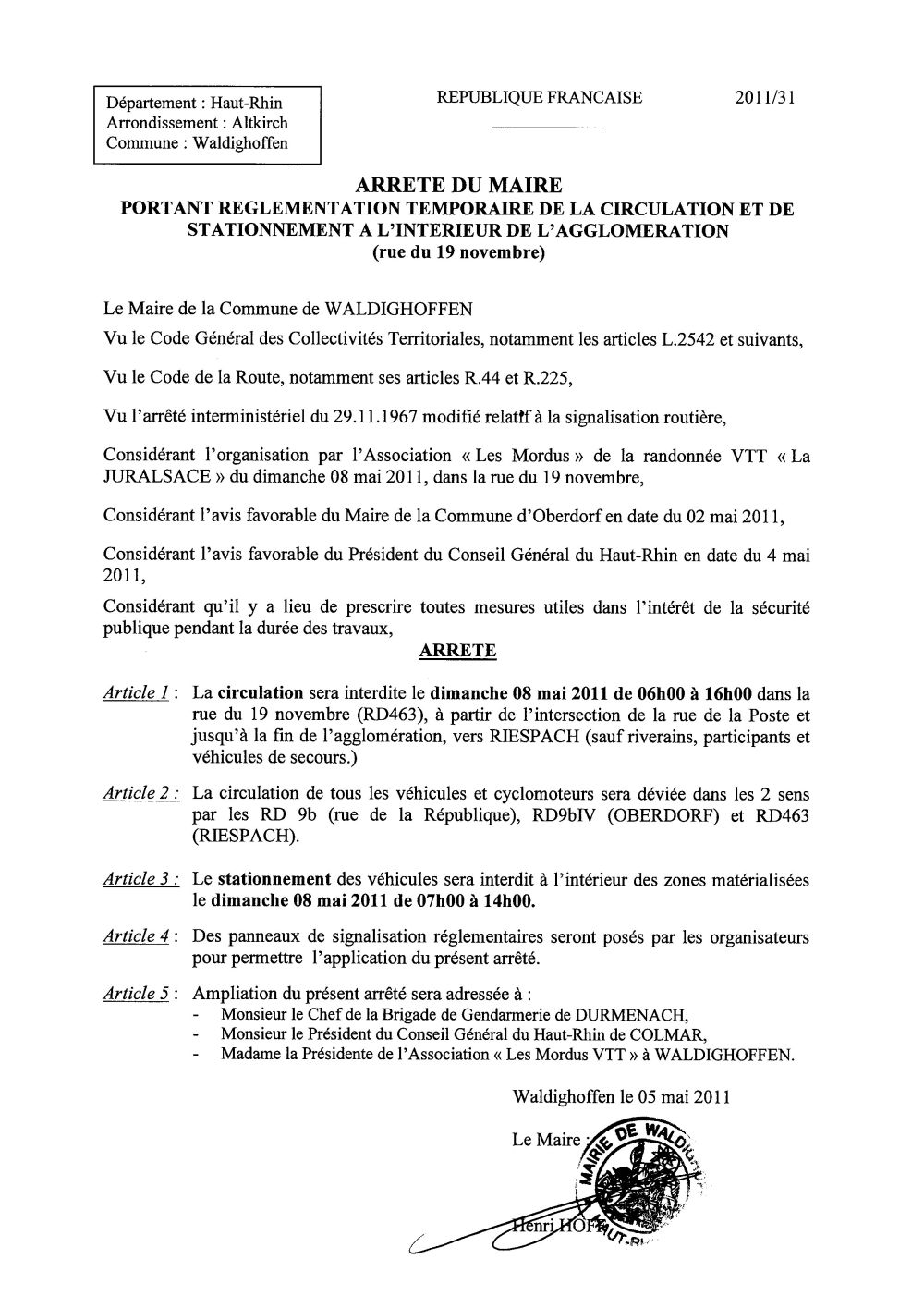Arrêté du Maire portant règlementation de la circulation et de stationnement