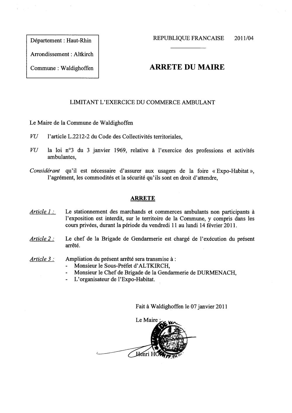 Arrêté du Maire limitant l'exercice du commerce ambulant sur le territoire de la Commue à l'occasion de l'organisation de la 28ème exposition "EXPO-HABITAT".
