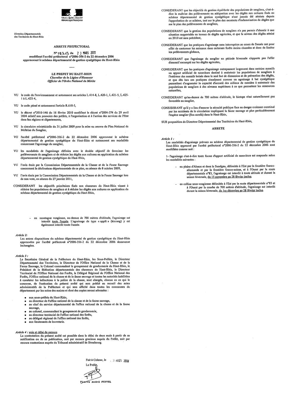 Arrêté préfectoral n°08313 du 23 mars 2011 modifiant l'arrêté préfectoral n°2006-356-2 du 22 décembre 2006 approuvant le schéma départemental de gestion cynégétique du Haut-Rhin.
