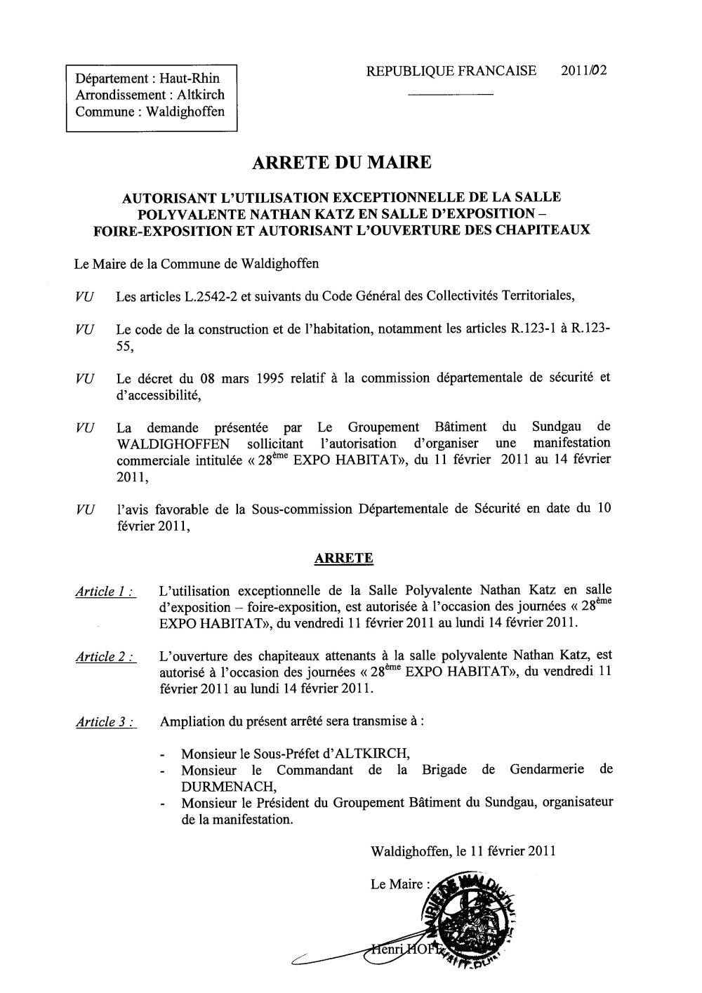 Arrêté n°2011/02 autorisant l'utilisation de la Salle Polyvalente / Expo-Habitat
