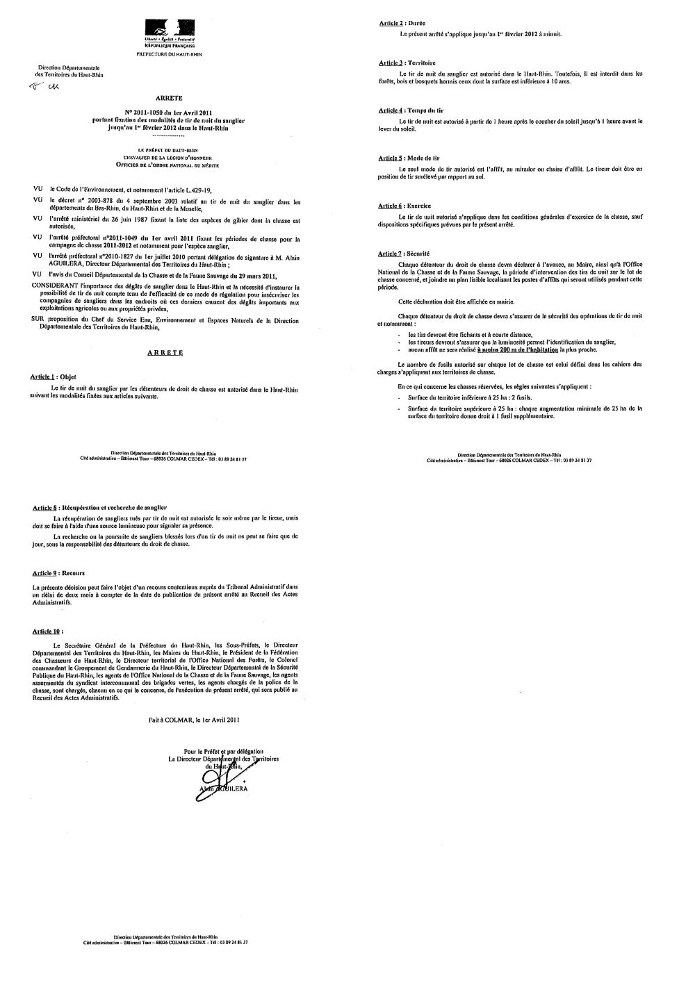 Arrêté n°2011-1050 du 1er avril 2011 portant fixation des modalités de tir de nuit du sanglier jusqu'au 1er février 2012 dans le Haut-Rhin.
