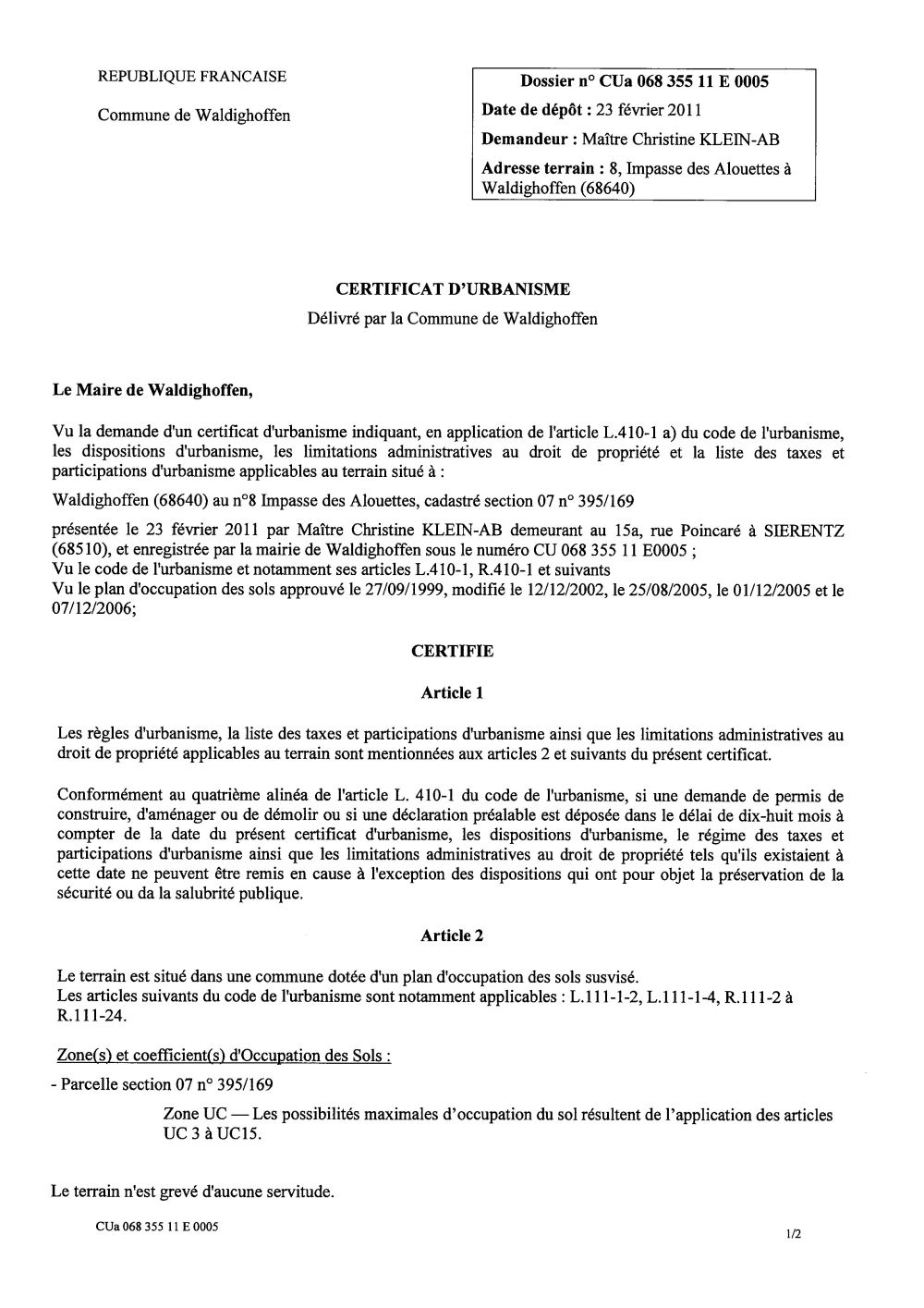 Un certificat d'urbanisme a été établi pour Maître Christine KLEIN-AB en date du 16 mars 2011, pour un terrain situé au 8 Impasse des Alouettes. Dossier n° CU 068 355 11 E 0005.