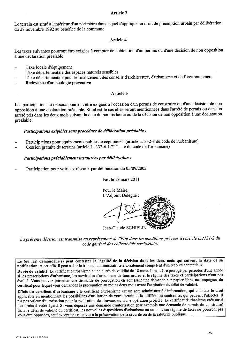 Certificat d'urbanisme a été établi pour Madame PEREZ Juliette en date du 18 mars 2011, pour un terrain situé au 17 rue de Willer. Dossier n° CU 068 355 11 E 0006.
