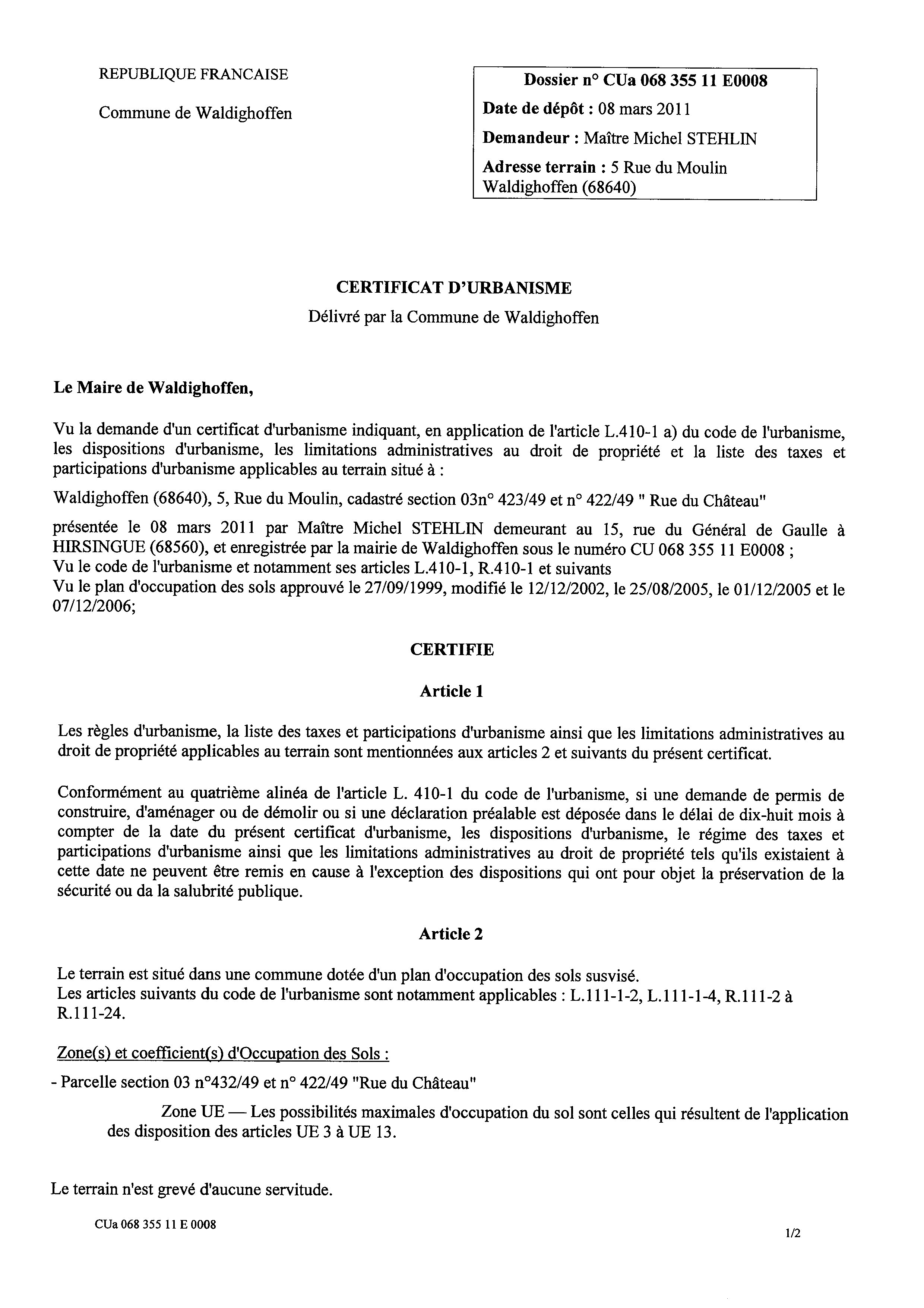 Certificat d'urbanisme n°11E0008 - Me Michel STEHLIN