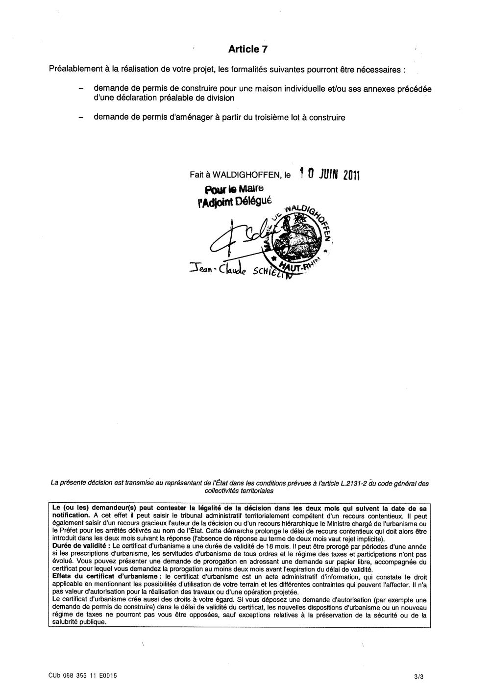 Un certificat d'urbanisme a été établi pour Maître Isaline CAUCHETIEZ en date du 10 juin 2011, pour un terrain situé rue des Faisans. Dossier n° CU 068 355 11 E0015.