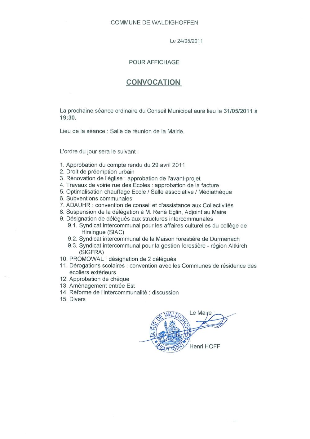 Convocation du Conseil Municipal le 31 mai 2011