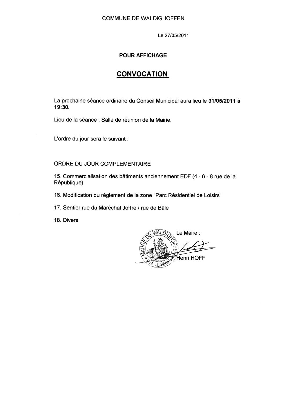 Vous êtes ici : Accueil Mairie Affichage public Annexes affichage public 2011 Convocation du Conseil Municipal le 31 mai 2011