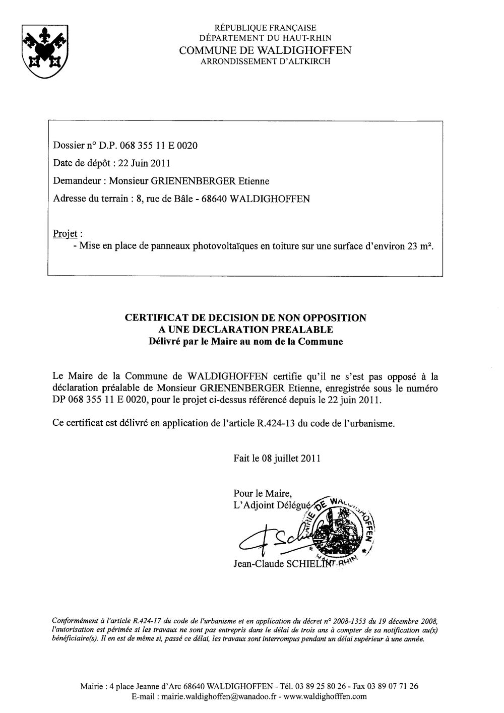 Non-opposition à la déclaration préalable n°11E0020 - M. GRIENENBERGER Etienne
