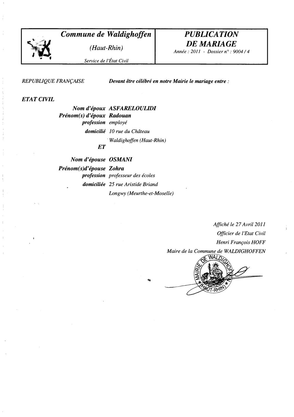 Publication de mariage M. ASFARELOULIDI Radouan et Mlle OSMANI Zohra