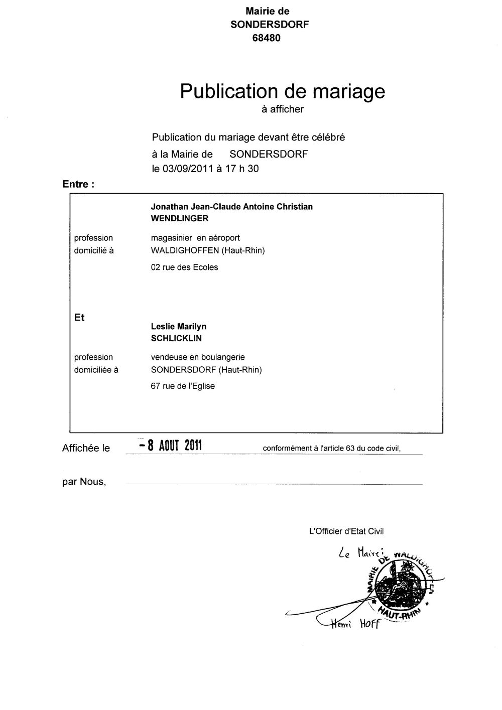 Publication de mariage M. WENDLINGER et Mlle SCHLICKLIN