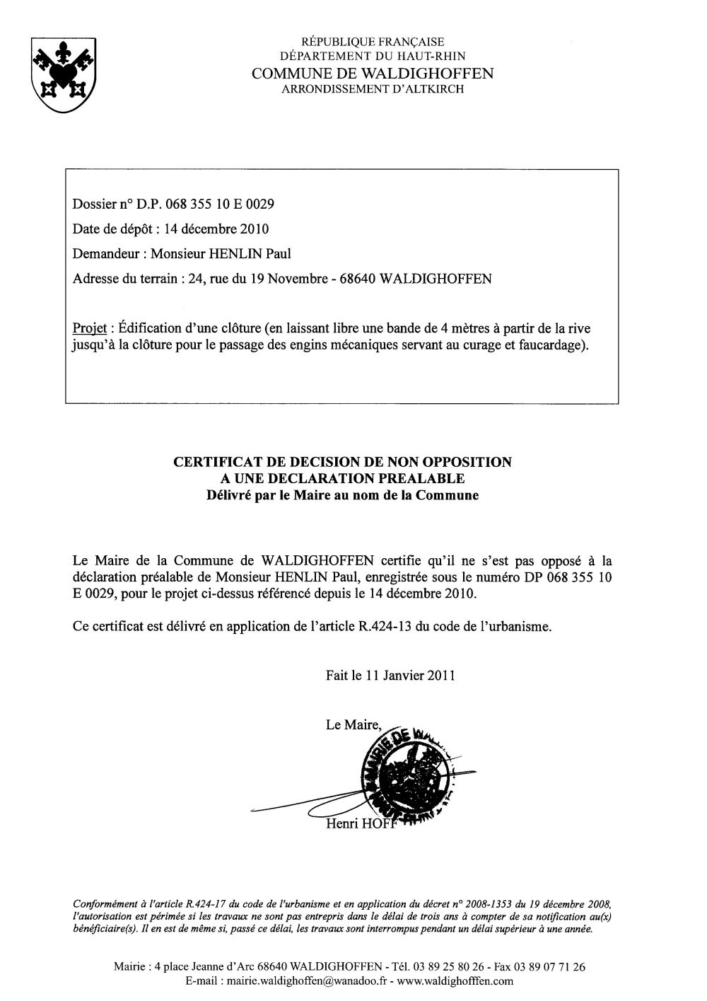 Non-opposition à une déclaration préalable - DP10E0029 - M. HENLIN