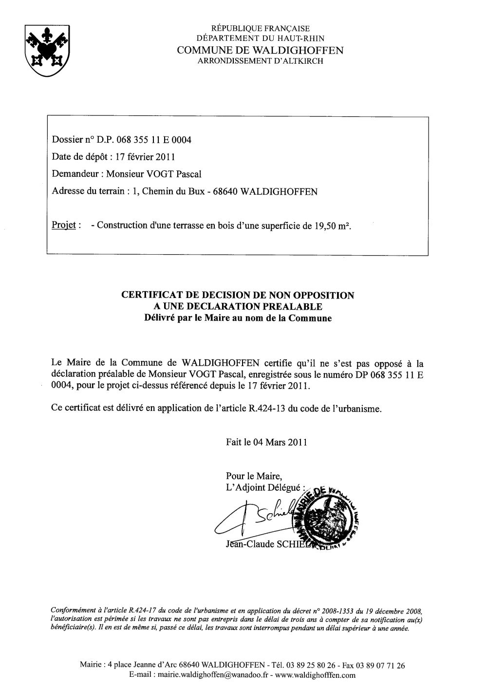 Non-opposition à une déclaration préalable n°11E0004 - M. VOGT Pascal