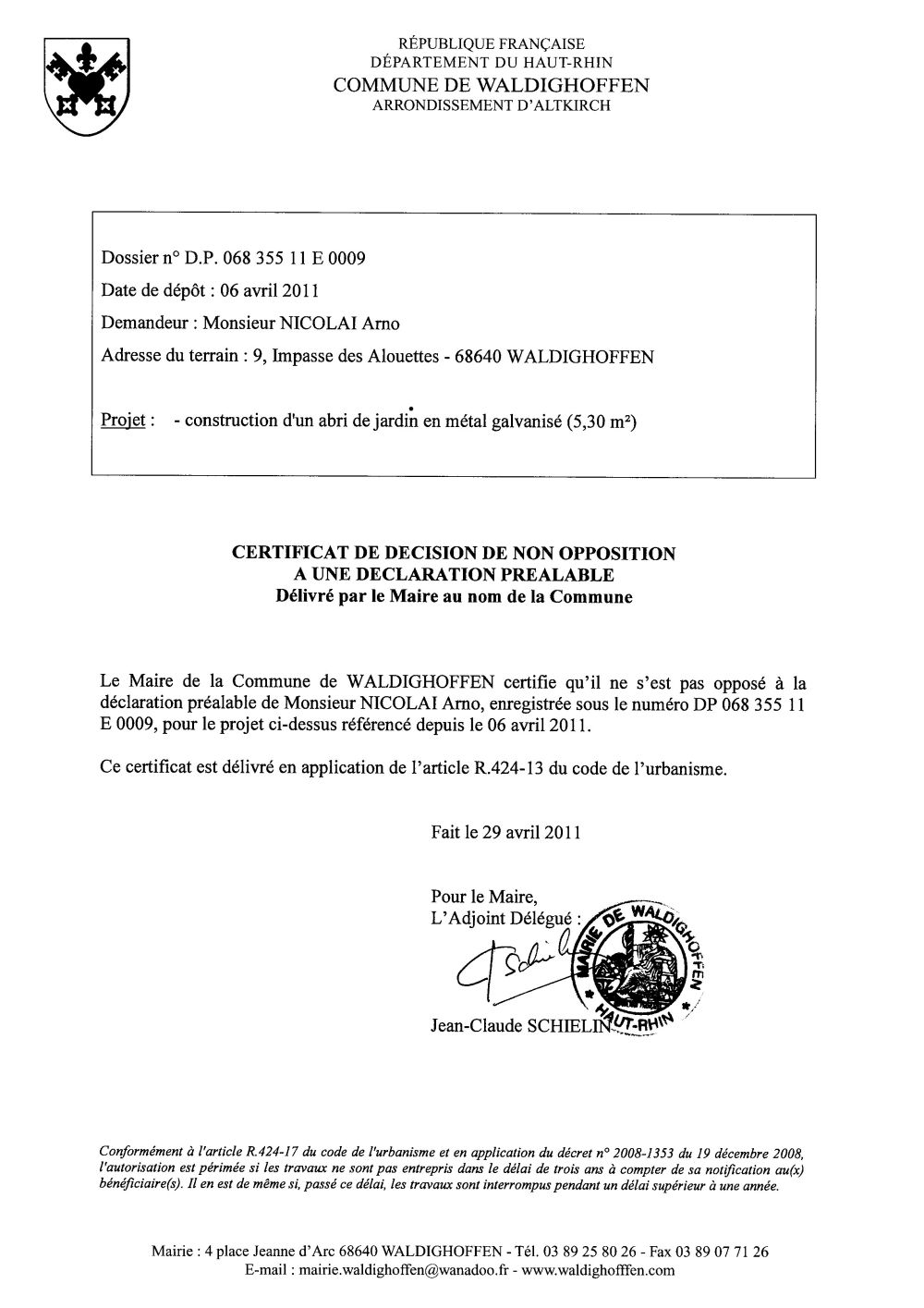 Non-opposition à une déclaration préalable n°11E0009 - M. NICOLAI