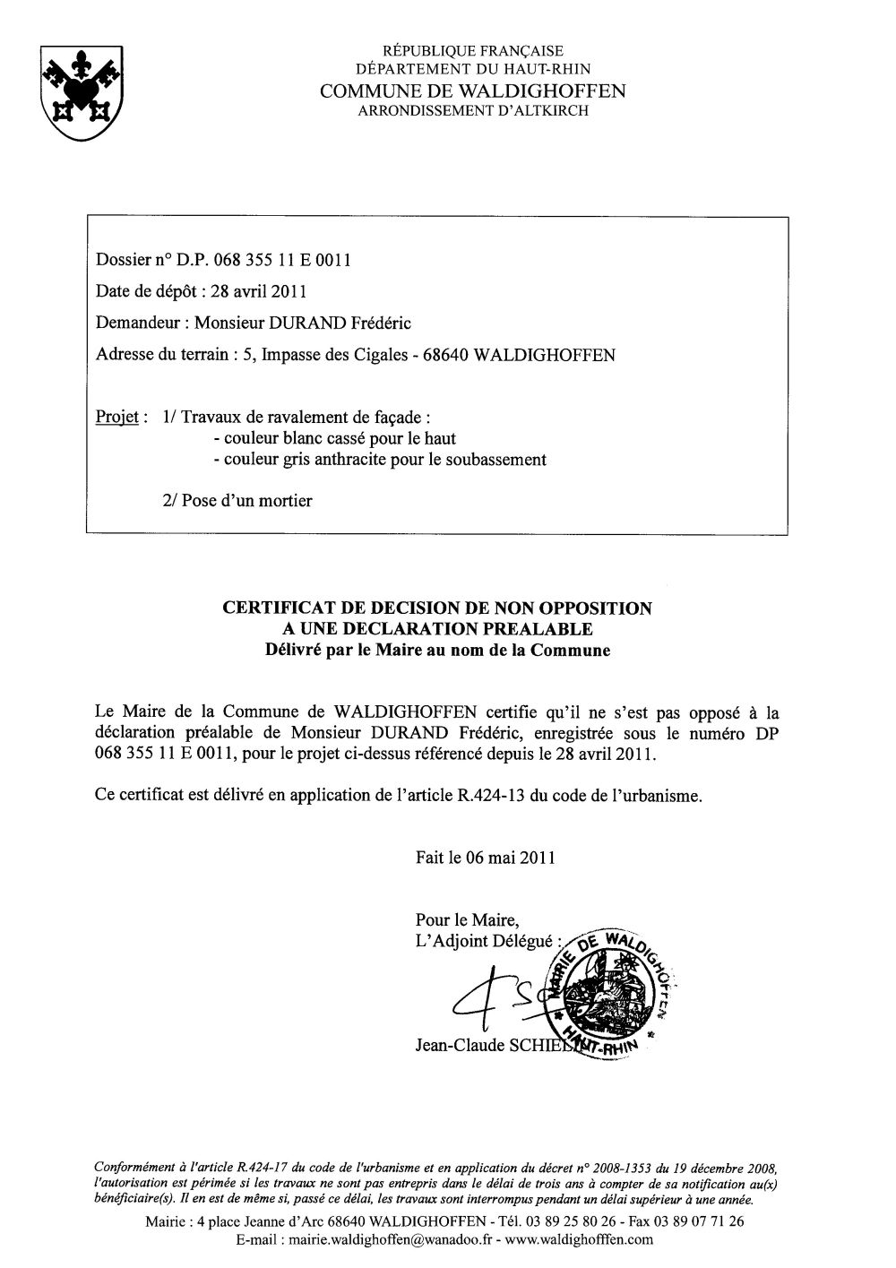 Non-opposition à une déclaration préalable n°11E0011 - M. DURAND Frédéric