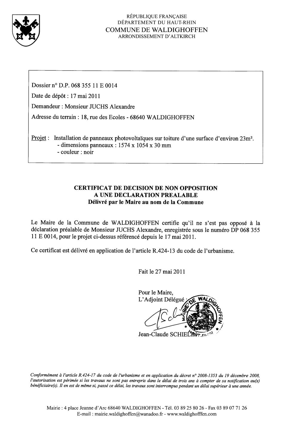 Non-opposition à la déclaration préalable n°11E0014 - M. JUCHS Alexandre