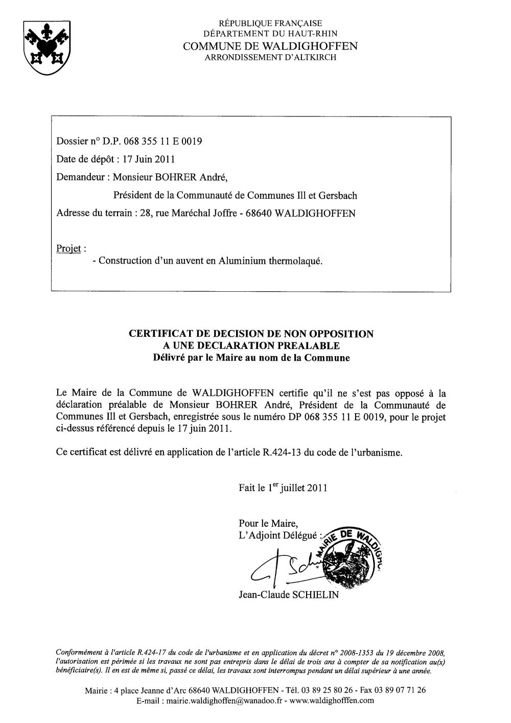 Non-opposition à la déclaration préalable n°11E0019 - Communauté de Communes Ill et Gersbach