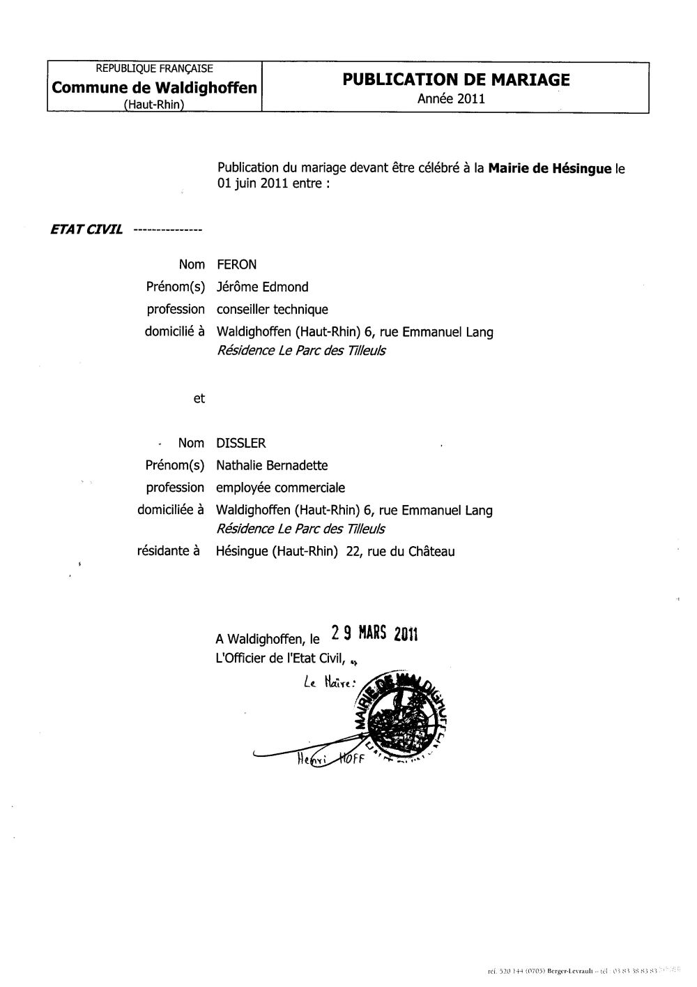 Publication de mariage projeté entre Monsieur FERON Jérôme, domicilié à WALDIGHOFFEN au 6 rue Emmanuel Lang, et Mademoiselle DISSLER Nathalie, domiciliée à WALDIGHOFFEN au 6 rue Emmanuel Lang, résidante à HESINGUE au 22 rue du Château.