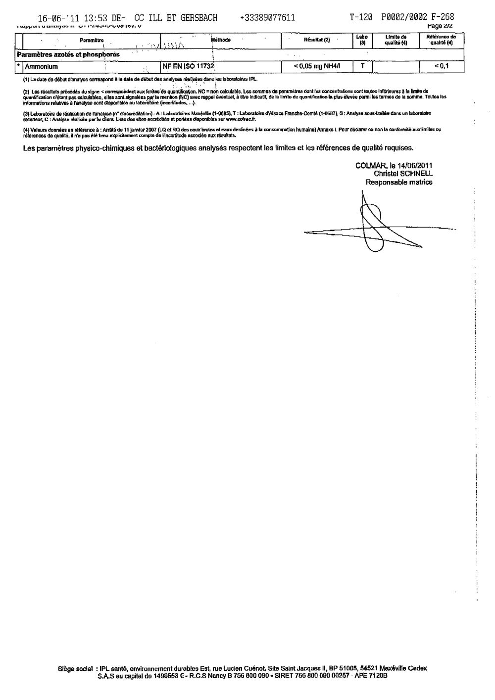 Rapport d'analyse d'eau potable n°C11-24308-D09 du 09/06/2011