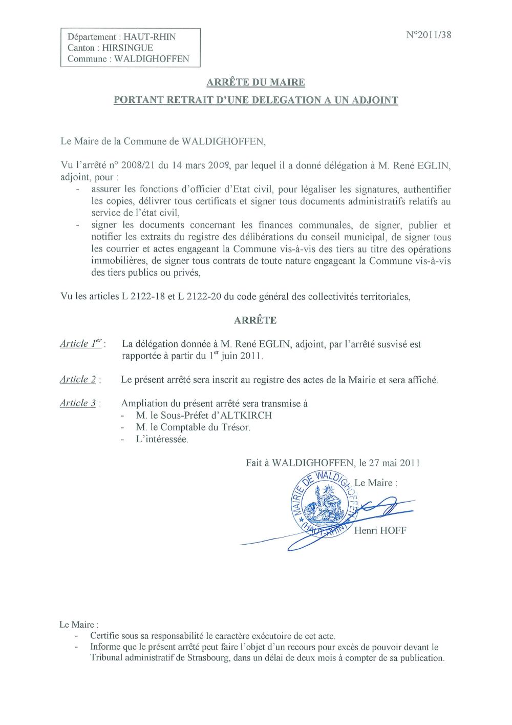 Arrêté du Maire n°2011/38 - Délégation