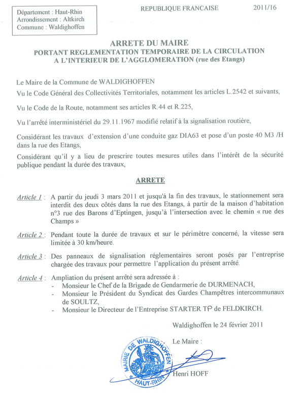 Arrêté de circulation temporaire rue des Etangs à Waldighoffen