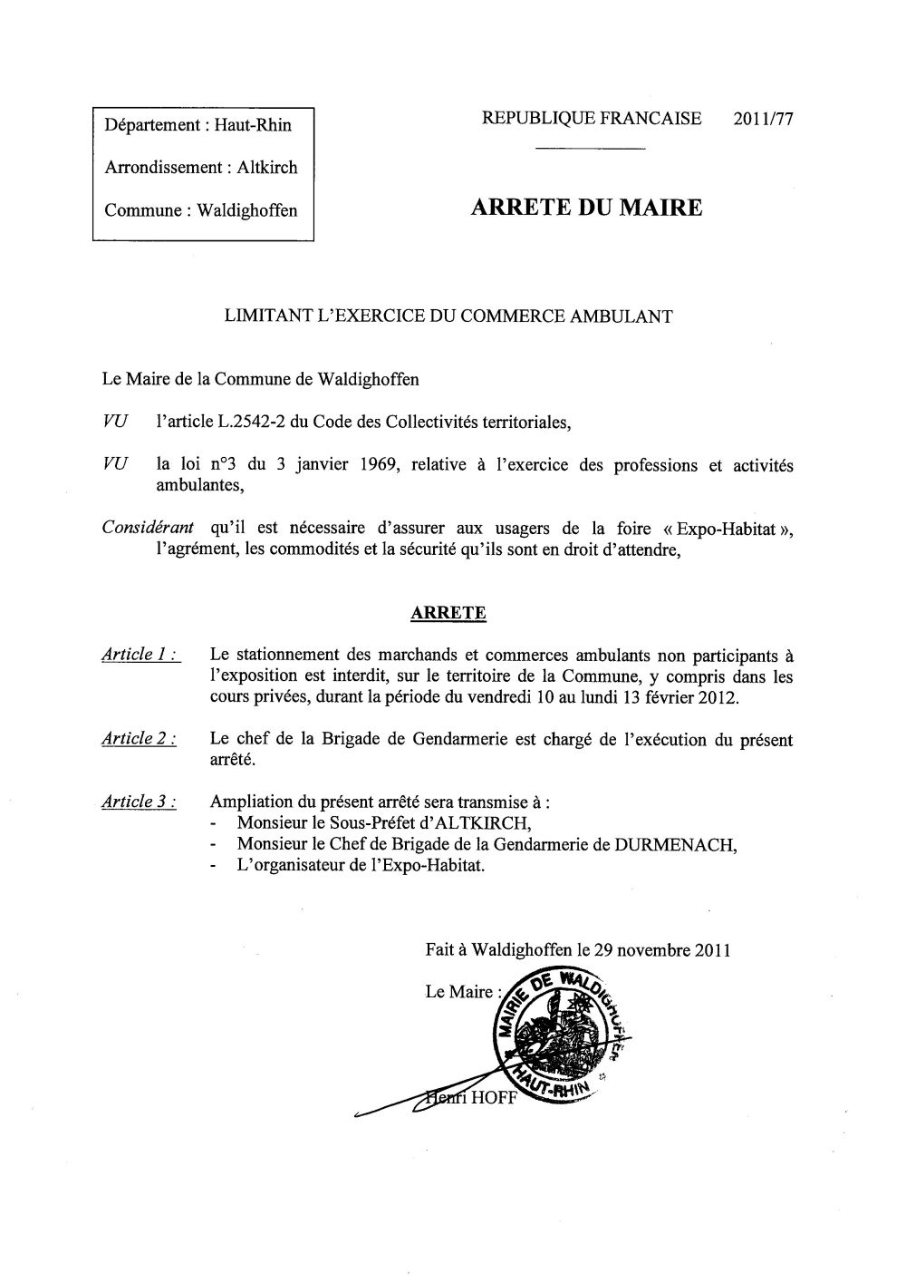Arrêté du Maire n°2011/77 limitant l'exercice du commerce ambulant à l'occasion de l'organisation de la 29ème exposition "EXPO HABITAT".