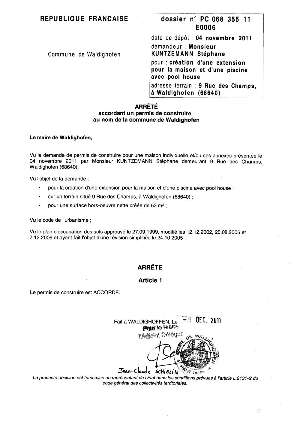Arrêté du permis de construire n°11E0006 - M. KUNTZELMANN